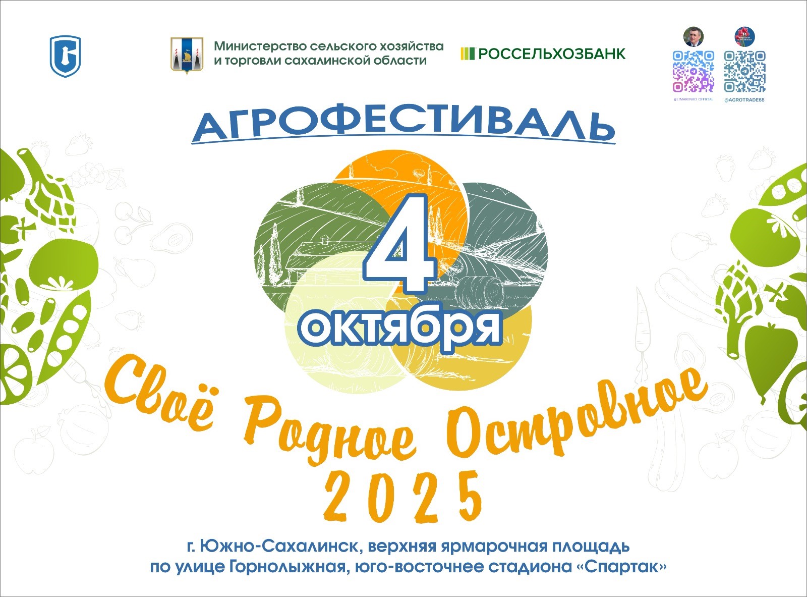 В эту субботу в Южно-Сахалинске пройдет сахалинский агрофестиваль! В эту субботу, 4 октября, с 9:00 до 16:00 часов в областном центре состоится осенний агрофестиваль «Своё Родное Островное-2025» на верхней площадке по улице Горнолыжная, расположенной к юго-востоку от стадиона «Спартак». На агрофестивале будет представлена продукция, включая новинки производства от островных сельхозпроизводителей и местных переработчиков. Картофель, овощи, мясные и молочные изделия, рыбную продукцию, мёд, домашних животных и птиц, изделия ручной работы и многое другое представят сельхозпредприятия, фермерские и личные подсобные хозяйства, ремесленники и местные мастера, садоводы и огородники. В широком ассортименте будут предложены саженцы плодово-ягодных и декоративных культур, выращенных дачниками, а также плоды и ягоды. Чтобы представить свою продукцию на фестивале, необходимо зарегистрироваться и получить электронное разрешение по ссылке. Это удобно, быстро, и не нужно лично обращаться в министерство — всё делается дистанционно с помощью компьютера. На фестивальной площади будет развёрнута деловая зона, где можно будет получить консультации от ведущих специалистов и экспертов федеральных служб: ФГБУ «ГЦАС Сахалинский», СахНИИСХ, Россельхозцентр и Россельхознадзор — по вопросам сельскохозяйственного производства, повышения плодородия почв, семеноводства картофеля, защиты растений от болезней и вредителей и многим другим важным вопросам. Ну и, конечно, атмосфера праздника! Её создадут творческие коллективы из разных районов. Программа яркая и насыщенная: зажигательные танцевальные номера, красочные костюмы и задорный вокал. Для взрослых и детей пройдут увлекательные мастер-классы, а тематические фотозоны дадут возможность запечатлеть самые эффектные моменты фестиваля. Кроме того, в программе запланированы конкурсы, где жюри оценит участников фестиваля по 11 уникальным номинациям. Победителей ждут ценные призы. Также на площадке пройдёт награждение победителей юбилейного регионального смотра-конкурса «Сахалинское качество-2025». Генеральным партнёром мероприятия выступает Россельхозбанк, который также приготовил для гостей интересный интерактив: оказание консультаций по продуктам банка, ароматный кофе и чай, аппетитные угощения, а также приятные сюрпризы и подарки. Отметим, что для выстраивания доступной логистики гостей фестиваля будут доставлять шаттлы: два бесплатных автобуса будут забирать пассажиров с Площади Победы (рядом с парковкой) и бесплатно доставлять к фестивальной площадке, а затем возвращать на исходные позиции с интервалом 20–30 минут. Также будет организовано одностороннее движение (с севера на юг) автотранспорта по улице Горнолыжная и Священномученика Илариона Троицкого. Все подробности можно узнать по телефону: 8 (4242) 67-27-33. Ждём всех на самом ярком событии осени! Не упустите возможность окунуться в атмосферу праздника, познакомиться с достижениями островных производителей и открыть для себя уникальные товары, созданные с любовью к родной земле!